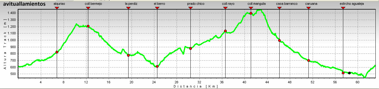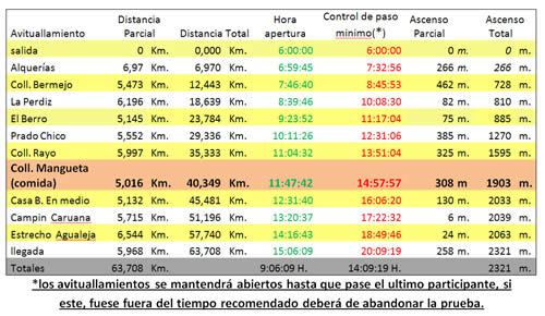 Los puntos de avituallamiento, distancias y horario de apertura y control de paso mínimo, son los siguientes (En el Coll. Mangueta el avituallamiento será de una comida) :
